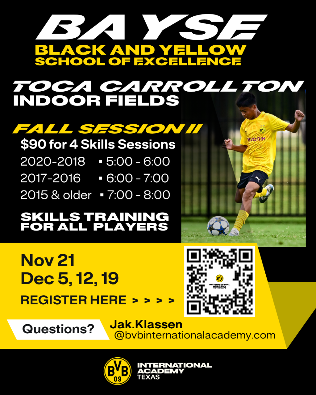 BVB Academy America is dedicated to the growth and development of every BVB soccer player, striving for the total development of the individual and the team. Development, including technical skills, tactical knowledge, physical power and fitness, confidence, leadership and the achievement of goals will be accomplished through perseverance, work ethic, sacrifice, dedication, sportsmanship and a belief in both themselves and the team.